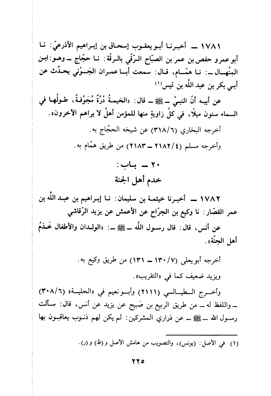 1781 - أخبرنا أبو يعقوب إسحاق بن إبراهيم الأذرعيّ: نا أبو عمرو حفص بن عمر بن الصبّاح الرّقّي بالرقّة: نا حجّاج -وهو: ابن المِنْهال-: نا همّام، قال: سمعت أبا عمران الجَوْني يحدِّث عن أبي بكر بن عبد الله بن قيس (¬1)