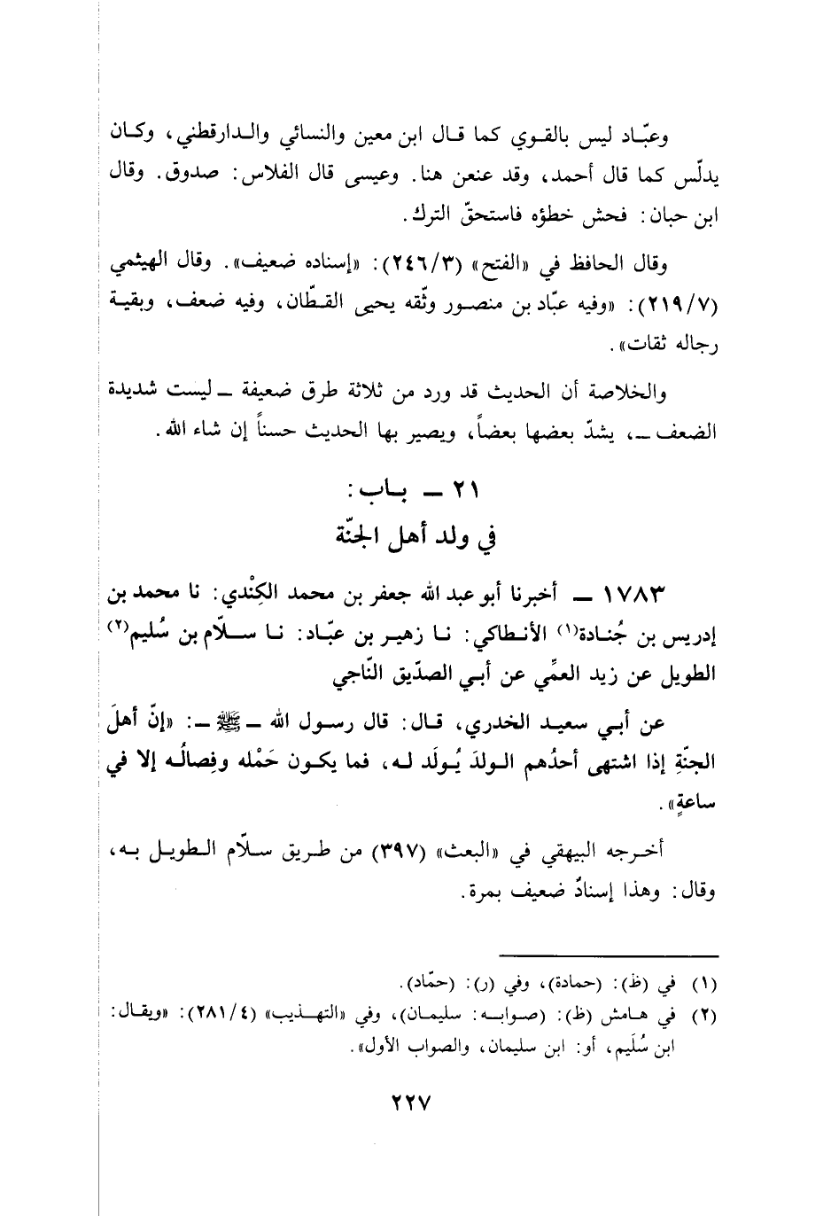 وعبّاد ليس بالقوي كما قال ابن معين والنسائي والدارقطني، وكان يدلّس كما قال أحمد، وقد عنعن هنا. وعيسى قال الفلاس: صدوق. وقال ابن حبان: فحش خطؤه فاستحقّ الترك.