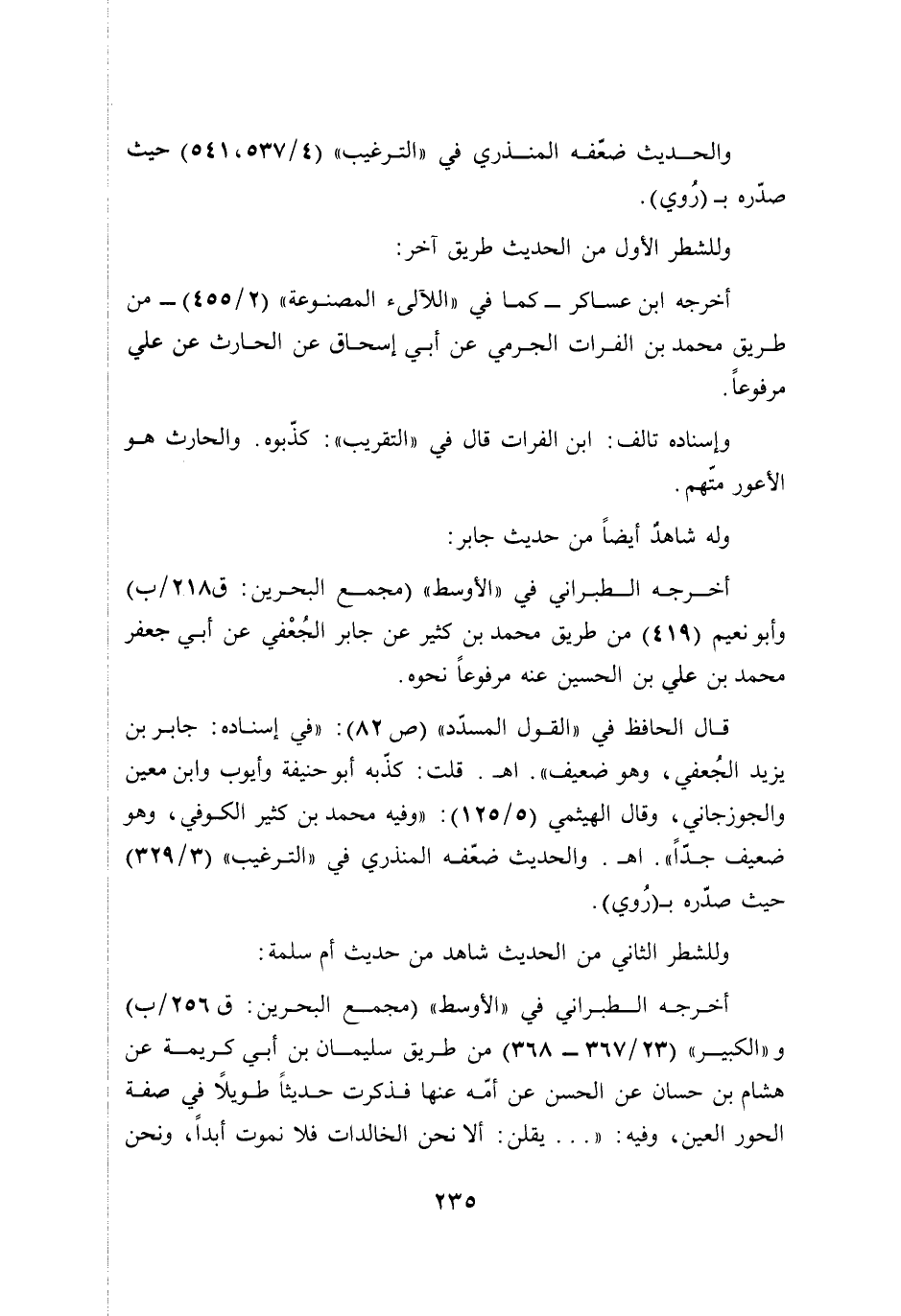 قال الحافظ في "القول المسدّد" (ص 82): "في إسناده: جابر بن يزيد الجُعفي، وهو ضعيف". أهـ. قلت: كذّبه أبو حنيفة وأيوب وابن معين والجوزجاني، وقال الهيثمي (5/ 125): "وفيه محمد بن كثير الكوفي، وهو ضعيف جدًّا". أهـ. والحديث ضعّفه المنذري في "الترغيب" (3/ 329) حيث صدّره بـ (رُوي).