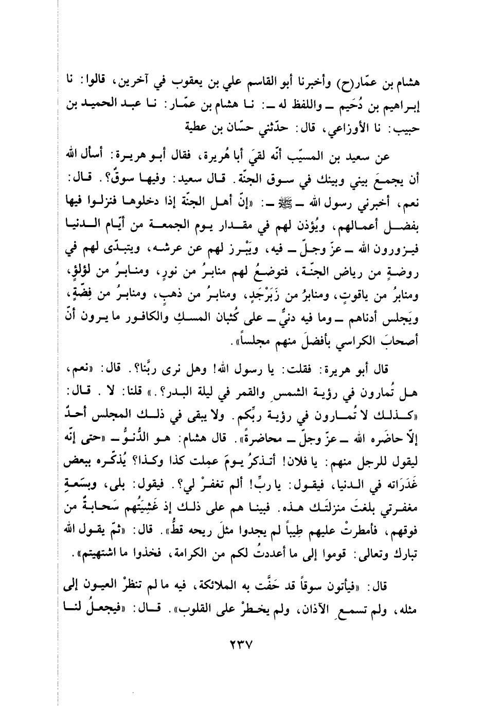عن سعيد بن المسيّب أنّه لقيَ أبا هُريرة، فقال أبو هريرة: أسال الله أن يجمعَ بيني وبينك في سوق الجنّة. قال سعيد: وفيها سوقٌ؟. قال: نعم، أخبرني رسول الله - صلى الله عليه وسلم -: "إنّ أهل الجنّة إذا دخلوها فنزلوا فيها بفضل أعمالهم، ويُؤذن لهم في مقدار يوم الجمعة من أيّام الدنيا فيزورون الله -عَزَّ وَجَلَّ - فيه، ويَبْرز لهم عن عرشه، ويتبدّى لهم في روضةٍ من رياض الجنّة، فتوضعُ لهم منابرُ من نورٍ، ومنابرُ من لؤلؤٍ، ومنابرُ من ياقوتٍ، ومنابرُ من زَبَرْجَدٍ، ومنابرُ من ذهبٍ، ومنابرُ من فِضّةٍ، ويَجلس أدناهم -وما فيه دنيٌّ- على كُثبان المسكِ والكافور ما يرون أنّ أصحابَ الكراسي بأفضلَ منهم مجلسًا".