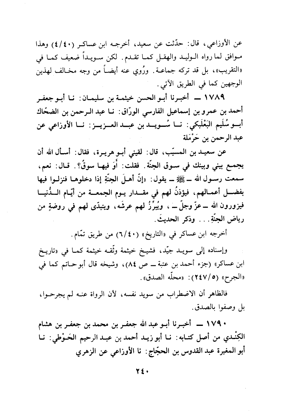 1789 - أخبرنا أبو الحسن خيثمة بن سليمان: نا أبو جعفر أحمد بن عمرو بن إسماعيل الفارسي الورّاق: نا عبد الرحمن بن الضحّاك أبو سُلَيم البَعْلَبكي: نا سُويد بن عبد العزيز: نا الأوزاعي عن عبد الرحمن بن حَرْمَلة
