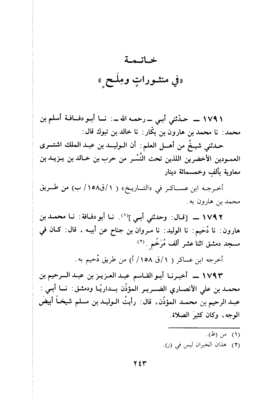 1792 - [قال: وحدثني أبي] (¬1). نا أبو دفافة: نا محمد بن هارون: نا دُحَيم: نا الوليد: نا مروان بن جناح عن أبيه، قال: كان في مسجد دمشق اثنا عشر ألف مُرَخّمٍ. (¬2)