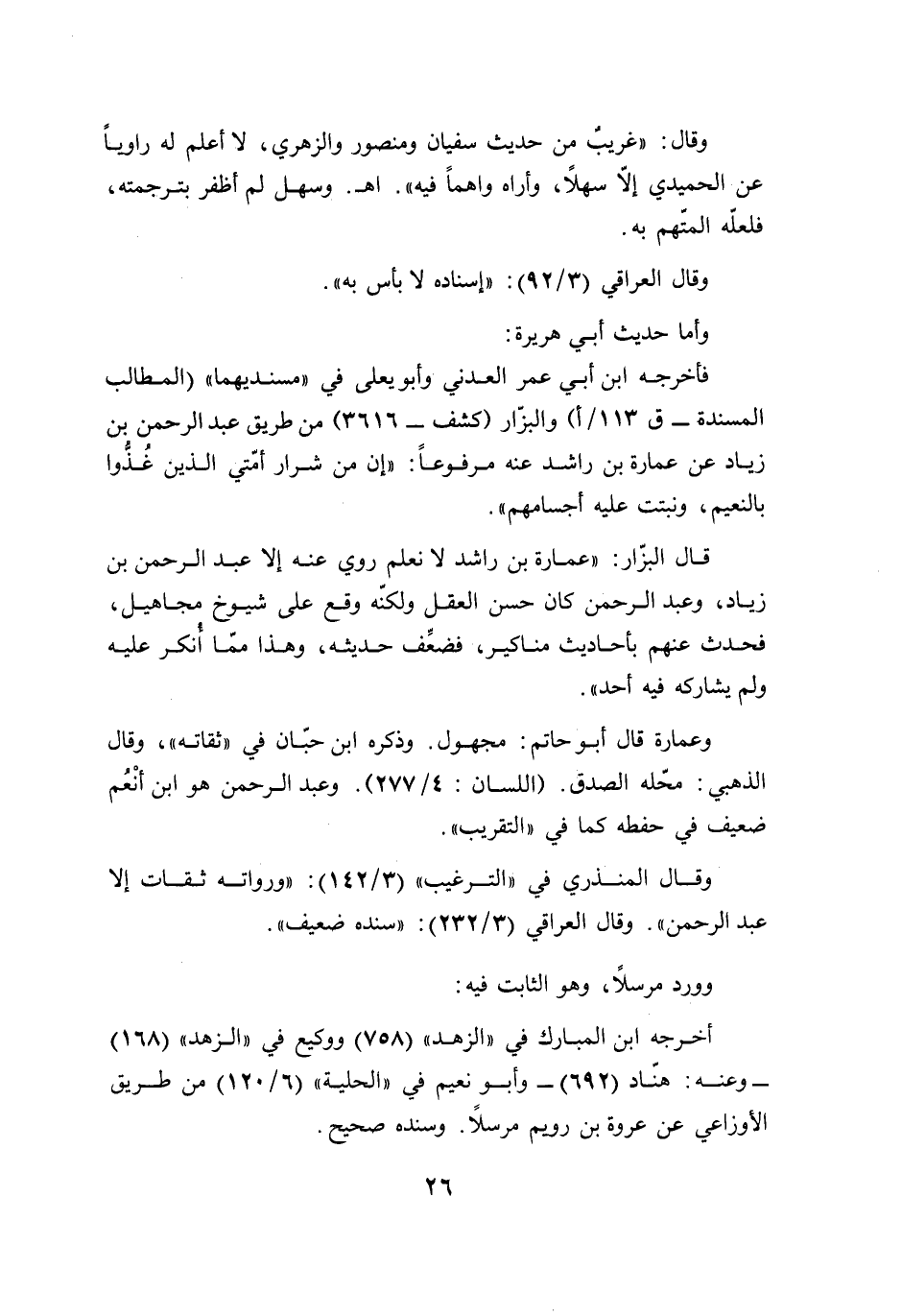 وعمارة قال أبو حاتم: مجهول. وذكره ابن حبّان في "ثقاته"، وقال الذهبي: محّله الصدق. (اللسان: 4/ 277). وعبد الرحمن هو ابن أنْعُم ضعيف في حفظه كما في "التقريب".