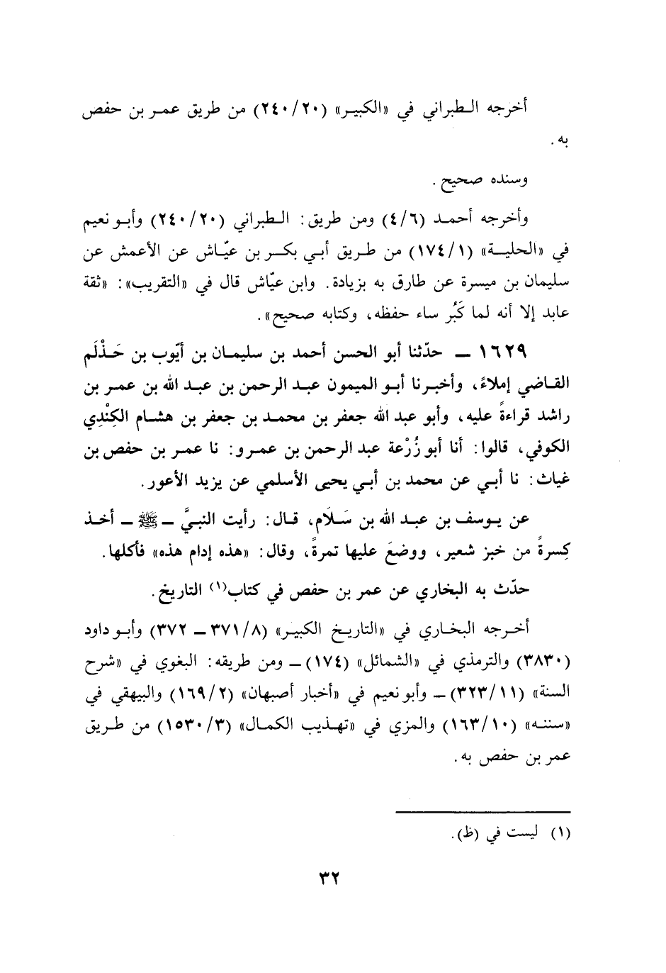 1629 - حدّثنا أبو الحسن أحمد بن سليمان بن أيّوب بن حَذْلَم القاضي إملاءً، وأخبرنا أبو الميمون عبد الرحمن بن عبد الله بن عمر بن راشد قراءةً عليه، وأبو عبد الله جعفر بن محمَّد بن جعفر بن هشام الكِنْدِي الكوفي، قالوا: أنا أبو زُرْعة عبد الرحمن بن عمرو: نا عمر بن حفص بن غياث: نا أبي عن محمَّد بن أبي يحيى الأسلمي عن يزيد الأعور. عن يوسف بن عبد الله بن سَلاَم، قال: رأيت النبيَّ - صلى الله عليه وسلم - أخذ كسرةً من خبز شعير، ووضعَ عليها تمرةً، وقال: "هذه إدام هذه" فأكلها.