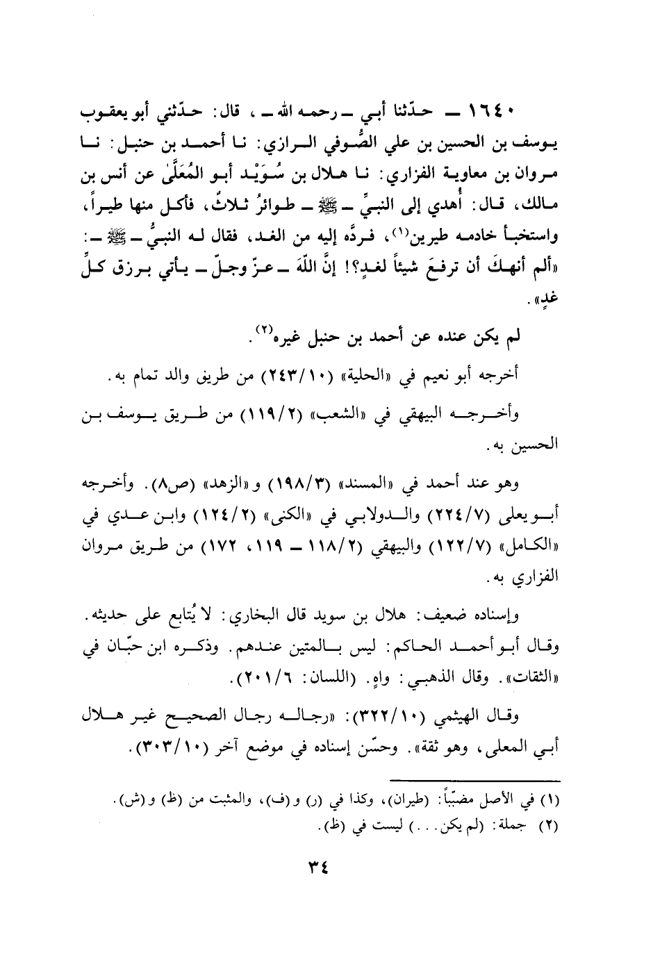 1640 - حدّثنا أبي -رحمه الله-، قال: حدّثني أبو يعقوب يوسف بن الحسين بن علي الصُّوفي الرازي: نا أحمد بن حنبل: نا مروان بن معاوية الفزاري: نا هلال بن سُوَيْد أبو المعَلَّى عن أنس بن