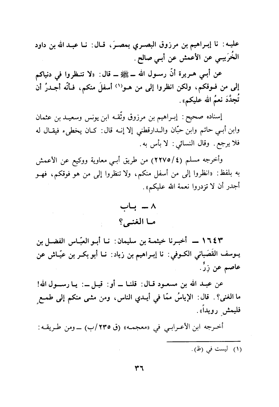 عن أبي هريرة أنّ رسول الله - صلى الله عليه وسلم - قال: "لا تنظروا في دنياكم إلى من فوقكم، ولكن انظروا إلى من هو (¬1) أسفلَ منكم، فأنّه أجدرُ أن تُجدَّدَ نعمُ الله عليكم".