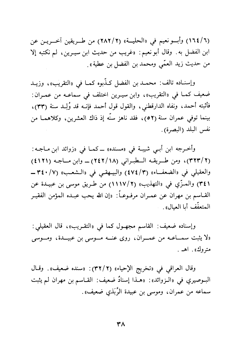 وقال العراقي في "تخريج الإحياء" (2/ 32): "سنده ضعيف". وقال البوصيري في "الزوائد": "هذا إسنادٌ ضعيف: القاسم بن مهران لم يثبت سماعه من عمران، وموسى بن عبيدة الرَّبَذي ضعيف".