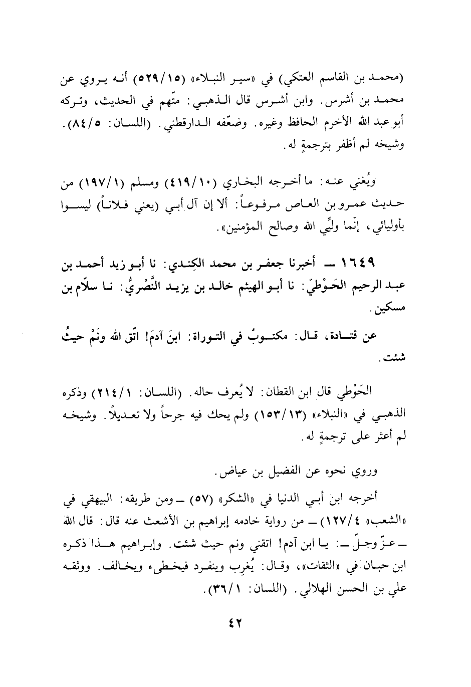 1649 - أخبرنا جعفر بن محمَّد الكِندي: نا أبو زيد أحمد بن عبد الرحيم الحَوْطيّ: نا أبو الهيثم خالد بن يزيد النَّصْريُّ: نا سلّام بن مسكين.