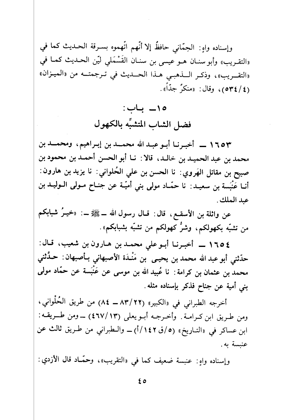 1653 - أخبرنا أبو عبد الله محمَّد بن إبراهيم، ومحمَّد بن محمَّد بن عبد الحميد بن خالد، قالا: نا أبو الحسن أحمد بن محمود بن صبيح بن مقاتل الهَروي: نا الحسن بن علي الخلواني: نا يزيد بن هارون: أنا عَنْبَسة بن سعيد: نا حمّاد مولى بني أميّة عن جناح مولى الوليد بن عبد الملك.