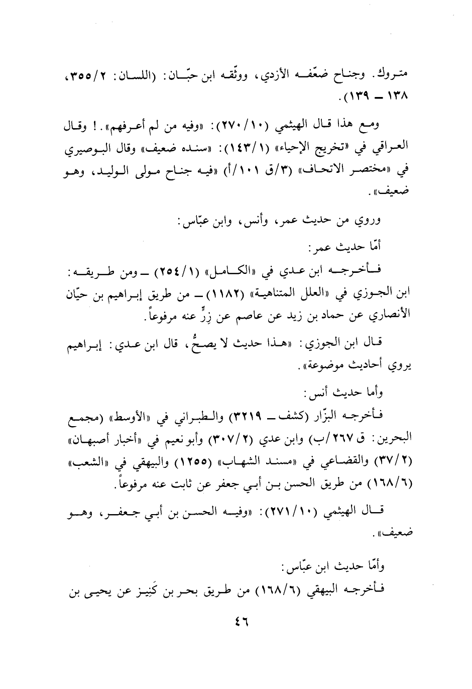 ومع هذا قال الهيثمي (10/ 270): "وفيه من لم أعرفهم".! وقال العراقي في "تخريج الإحياء" (1/ 143): "سنده ضعيف" وقال البوصيري في "مختصر الاتحاف" (3/ ق 101/أ) "فيه جناح مولى الوليد، وهو ضعيف".