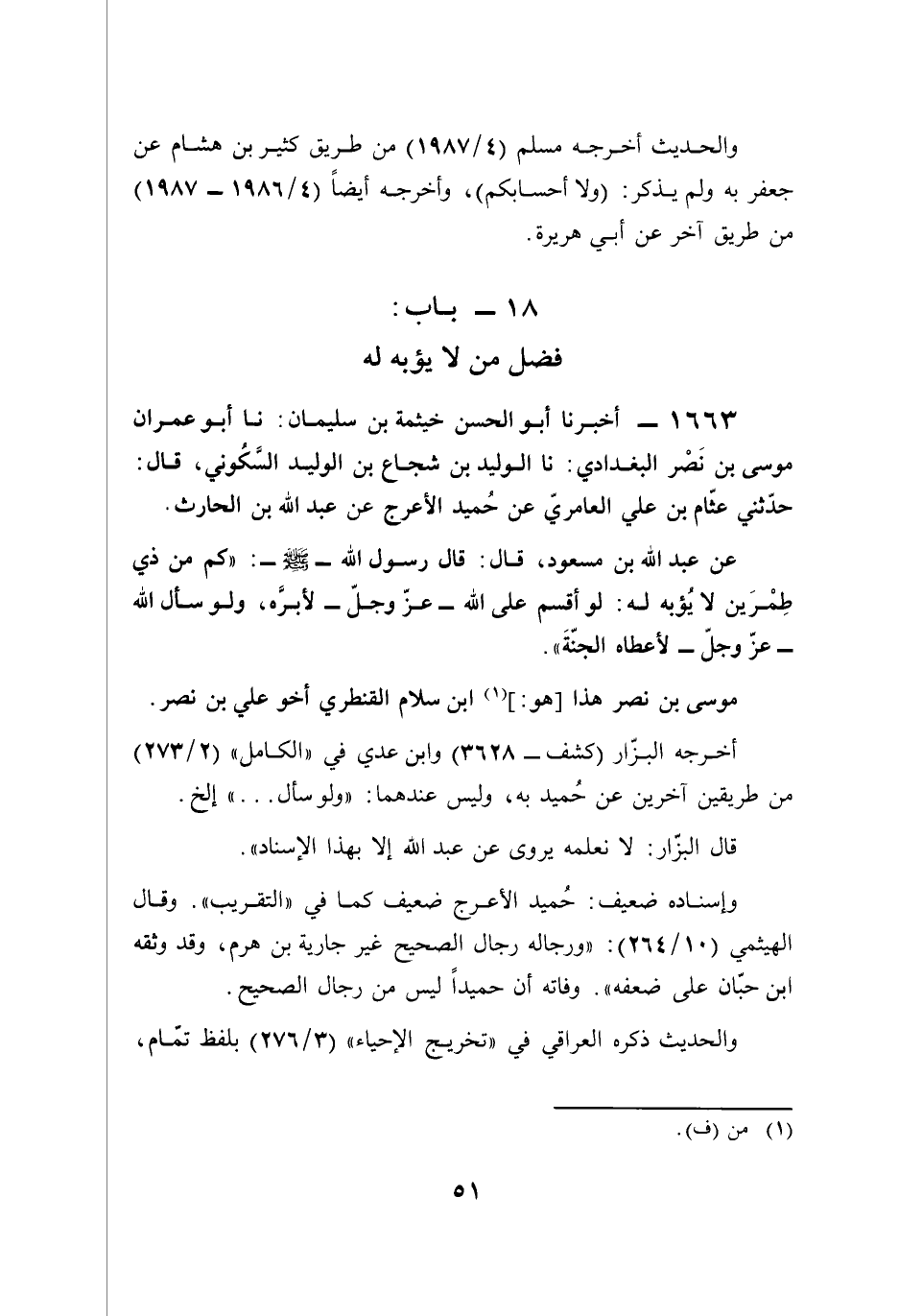 1663 - أخبرنا أبو الحسن خيثمة بن سليمان: نا أبو عمران موسى بن نَصْر البغدادي: نا الوليد بن شجاع بن الوليد السَّكوني، قال: حدّثني عثّام بن علي العامريّ عن حُميد الأعرج عن عبد الله بن الحارث.