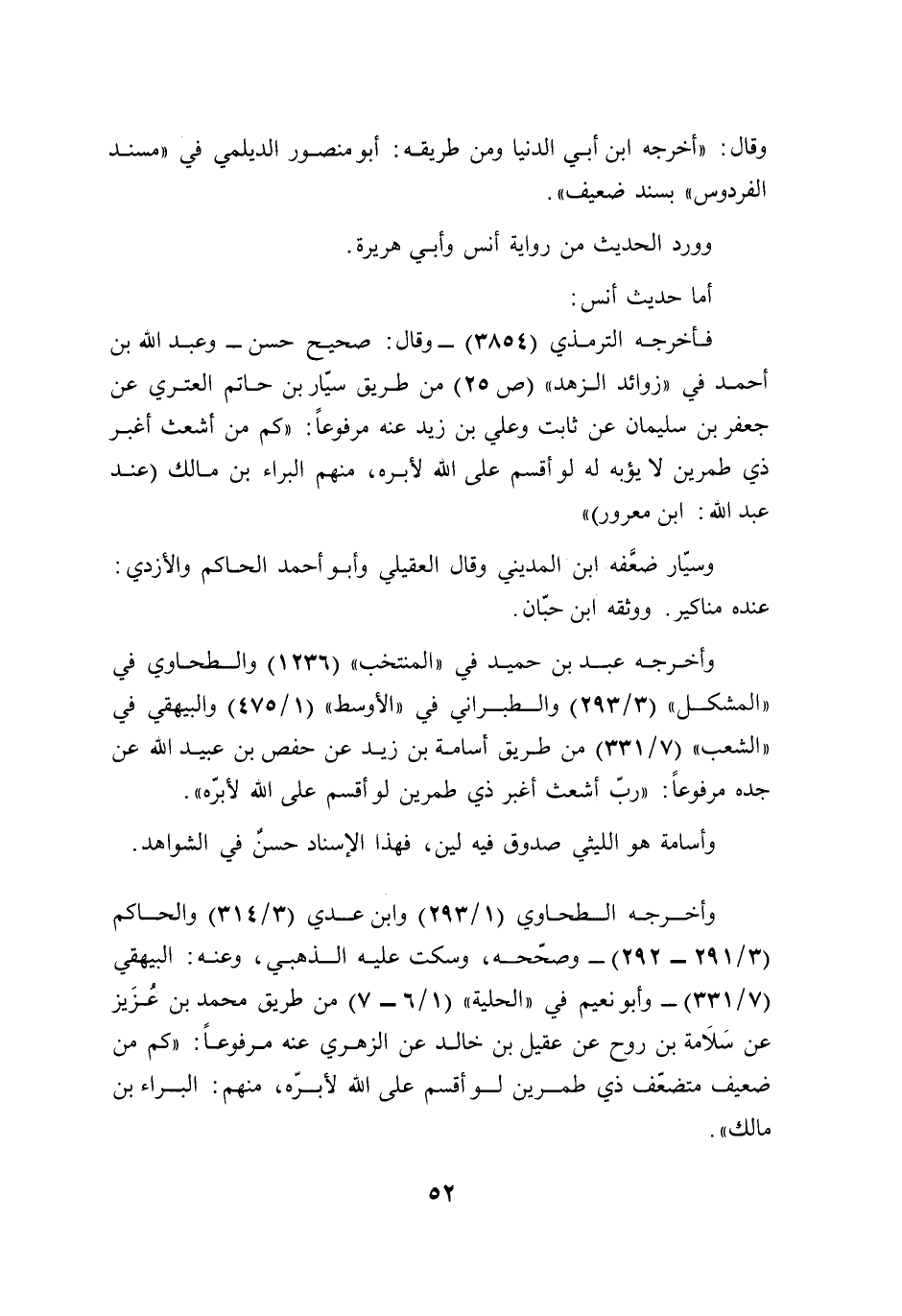 وأخرجه الطحاوي (1/ 293) وابن عدي (3/ 314) والحاكم (3/ 291 - 292) -وصحّحه، وسكت عليه الذهبي، وعنه: البيهقي (7/ 331) - وأبو نعيم في "الحلية" (1/ 6 - 7) من طريق محمَّد بن عُزَيز عن سَلَامة بن روح عن عقيل بن خالد عن الزهريّ عنه مرفوعًا: "كم من ضعيف متضعّف ذي طمرين لو أقسم على الله لأبرّه، منهم: البراء بن مالك".