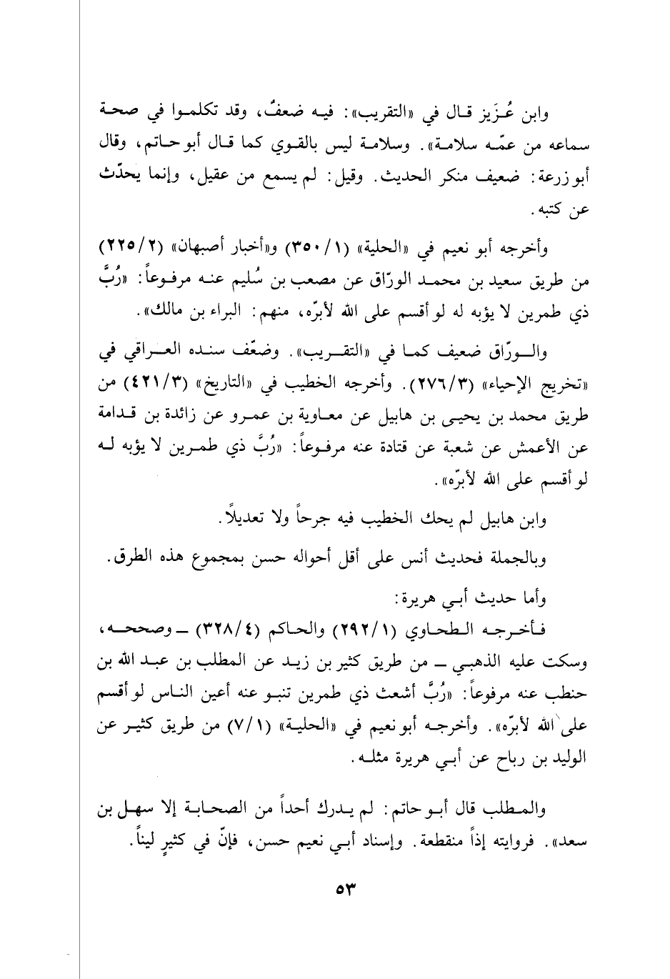 وأخرجه أبو نعيم في "الحلية" (1/ 350) و"أخبار أصبهان" (2/ 225) من طريق سعيد بن محمَّد الورّاق عن مصعب بن سُليم عنه مرفوعًا: "رُبَّ ذي طمرين لا يؤبه له لو أقسم على الله لأبرّه، منهم: البراء بن مالك".