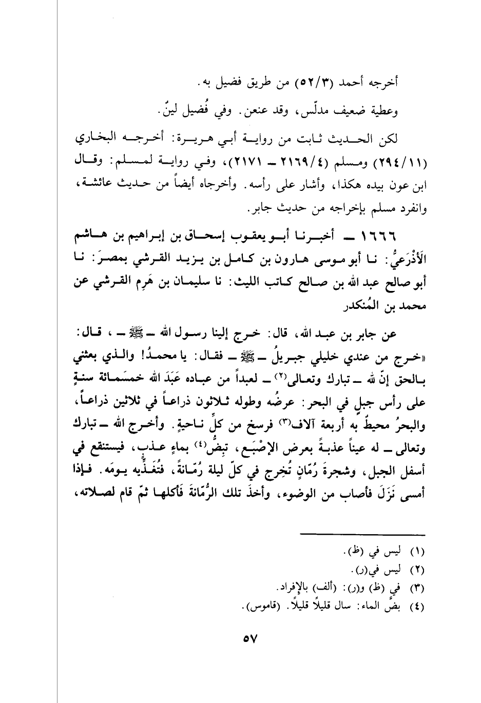 1666 - أخبرنا أبو يعقوب إسحاق بن إبراهيم بن هاشم الَأذْرَعيُّ: نا أبو موسى هارون بن كامل بن يزيد القرشي بمصرَ: نا أبو صالح عبد الله بن صالح كاتب الليث: نا سليمان بن هَرِم القرشي عن محمَّد بن المُنكدر
