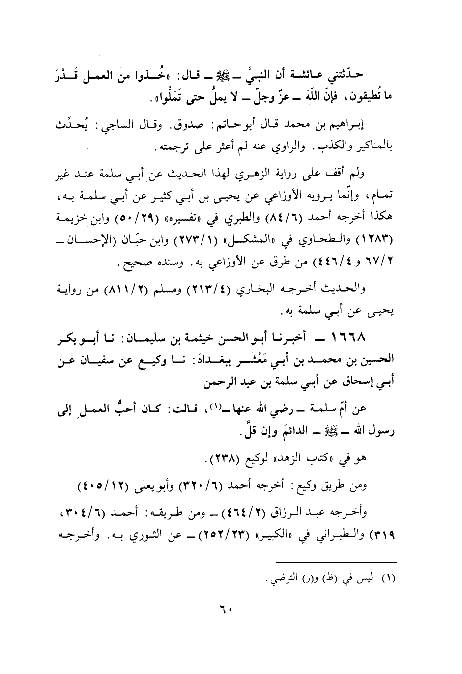 1668 - أخبرنا أبو الحسن خيثمة بن سليمان: نا أبو بكر الحسين بن محمد بن أبي مَعْشَر ببغدادَ: نا وكيع عن سفيان عن أبي إسحاق عن أبي سلمة بن عبد الرحمن