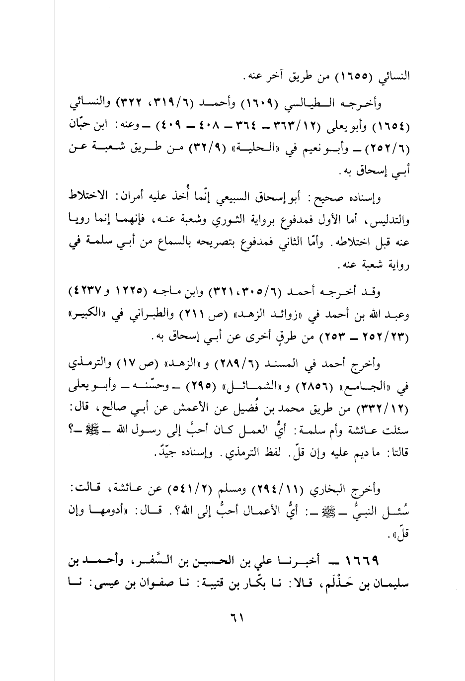 وإسناده صحيح: أبو إسحاق السبيعي إنّما أخذ عليه أمران: الاختلاط والتدليس، أما الأول فمدفوع برواية الثوري وشعبة عنه، فإنهما إنما رويا عنه قبل اختلاطه. وأمّا الثاني فمدفوع بتصريحه بالسماع من أبي سلمة في رواية شعبة عنه.