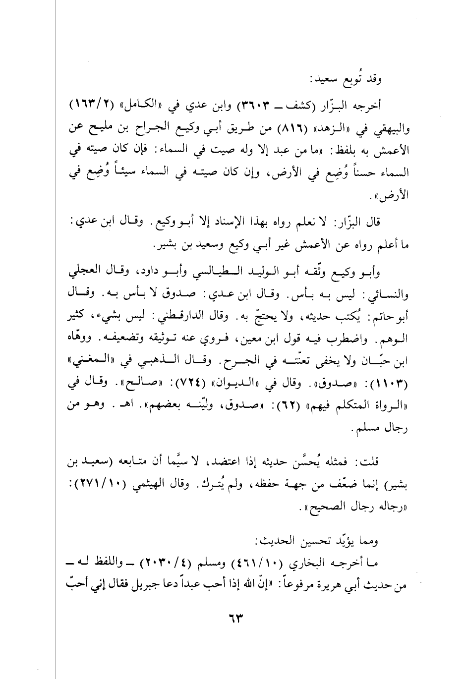 قلت: فمثله يُحسَّن حديثه إذا اعتضد، لاسيَّما أن متابعه (سعيد بن بشير) إنما ضعّف من جهة حفظه، ولم يُترك. وقال الهيثمي (10/ 271): "رجاله رجال الصحيح".