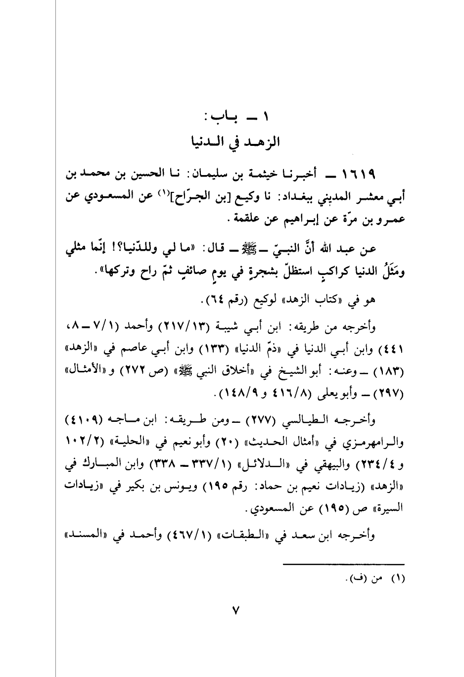 1619 - أخبرنا خيثمة بن سليمان: نا الحسين بن محمد بن أبي معشر المديني ببغداد: نا وكيع [بن الجرّاح] (¬1) عن المسعودي عن عمرو بن مرّة عن إبراهيم عن علقمة.