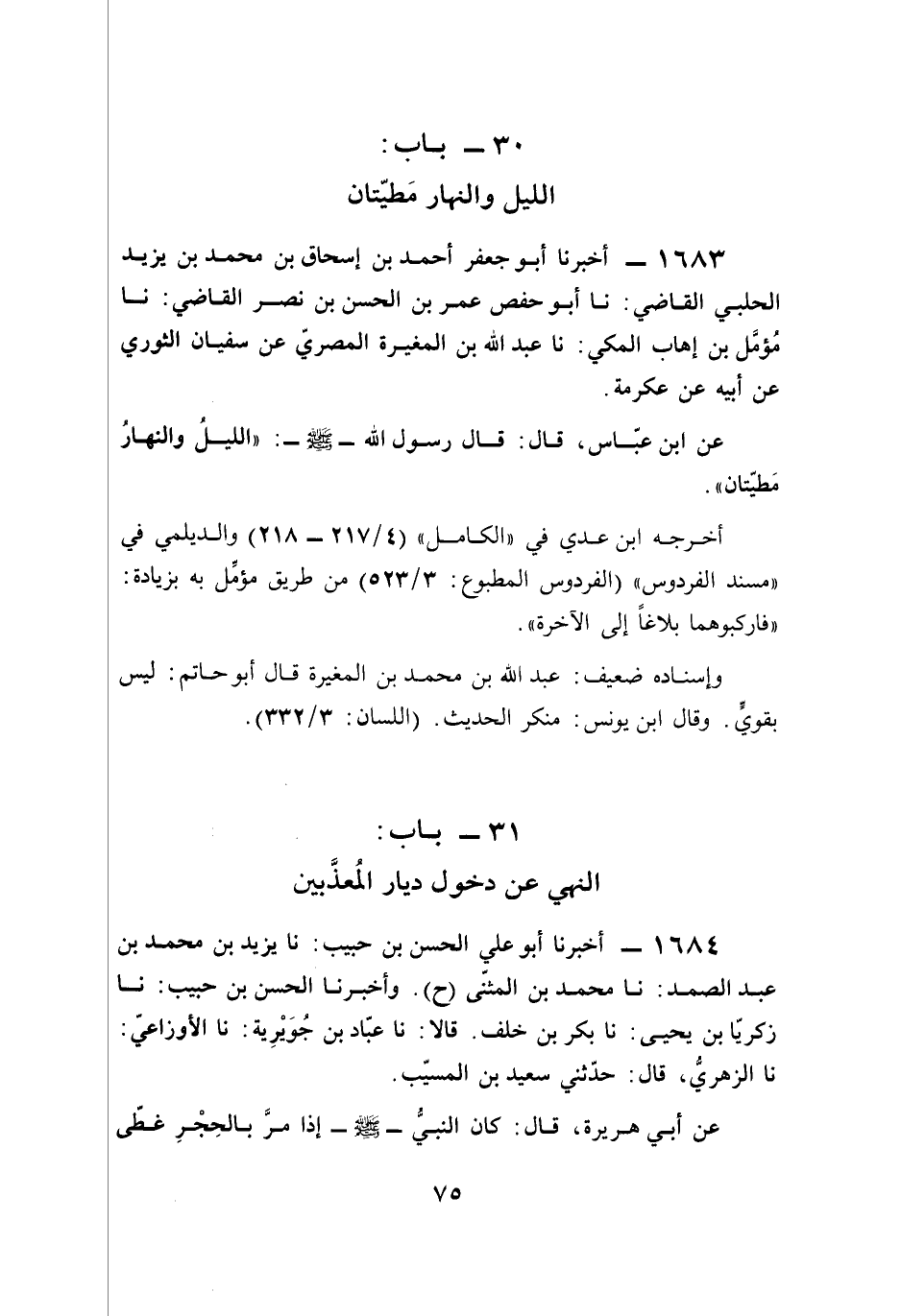 1684 - أخبرنا أبو علي الحسن بن حبيب: نا يزيد بن محمد بن عبد الصمد: نا محمَّد بن المثنّى (ح). وأخبرنا الحسن بن حبيب: نا زكريّا بن يحيى: نا بكر بن خلف. قالا: نا عبّاد بن جُوَيْرِية: نا الأوزاعيّ: نا الزهريُّ، قال: حدّثني سعيد بن المسيّب.