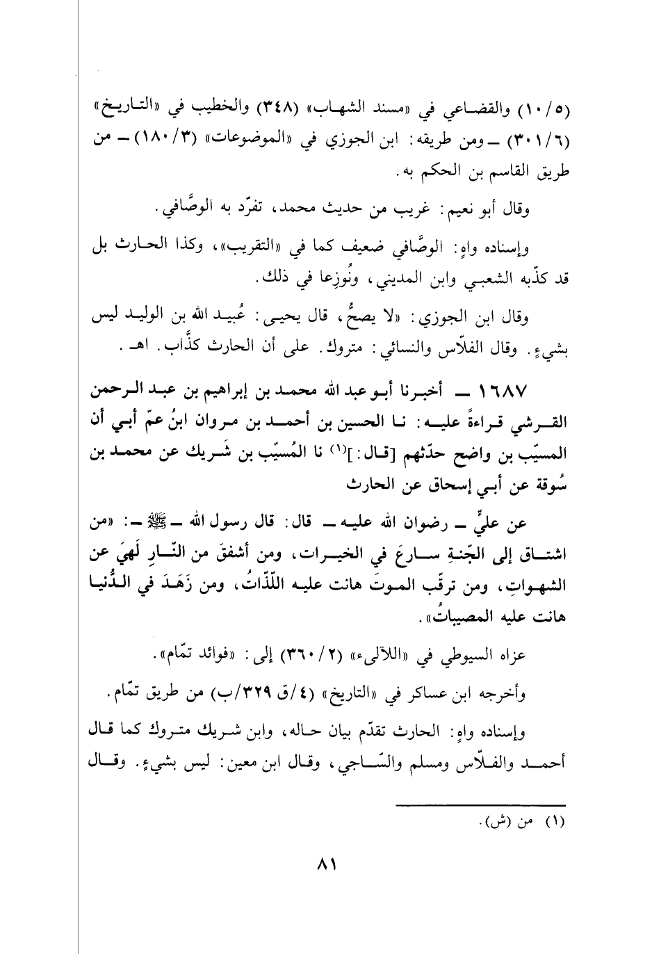 وقال ابن الجوزي: "لا يصحُّ، قال يحيى: عُبيد الله بن الوليد ليس بشيءٍ. وقال الفلاّس والنسائي: متروك. على أن الحارث كذَّاب. أهـ.