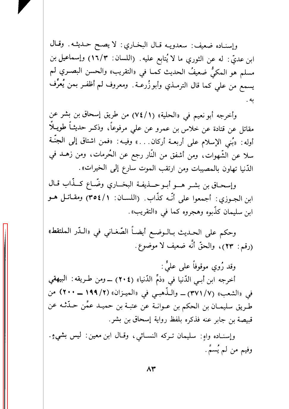 وإسناده ضعيف: سعدويه قال البخاري: لا يصح حديثه. وقال ابن عديّ: له عن الثوري ما لا يُتابع عليه. (اللسان: 3/ 16) واسماعيل بن مسلم هو المكيُّ ضعيفُ الحديث كما في "التقريب" والحسن البصري لم يسمع من علي كما قال الترمذي وأبو زُرعة. ومعروف لم أظفر بمن يُعرِّف به.