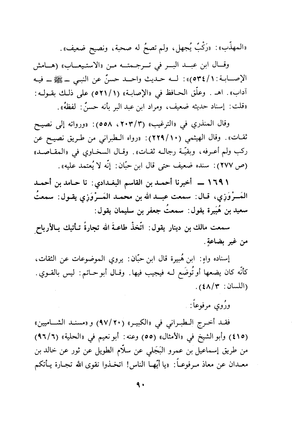 وقال ابن عبد البر في ترجمته من "الاستيعاب" (هامش الإصابة: 1/ 534) ": له حديث واحد حسنٌ عن النبي - صلى الله عليه وسلم - فيه آداب". أهـ. وعلّق الحافظ في "الإصابة" (1/ 521) على ذلك بقوله: "قلت: إسناد حديثه ضعيف، ومراد ابن عبد البر بأنه حسنٌ: لفظهُ".