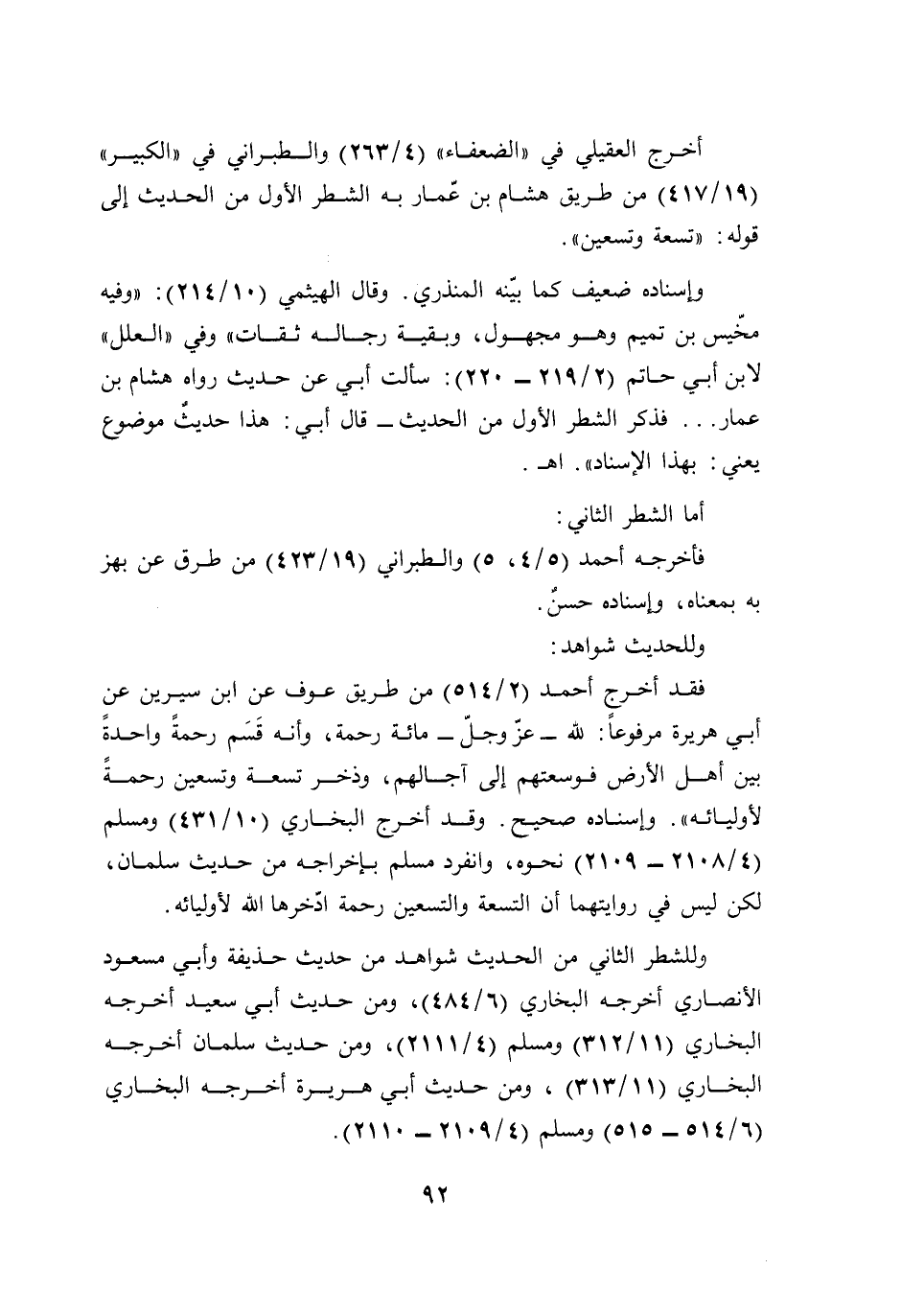 أخرج العقيلي في "الضعفاء" (4/ 263) والطبراني في "الكبير" (19/ 417) من طريق هشام بن عمّار به الشطر الأول من الحديث إلى قوله: "تسعة وتسعين".