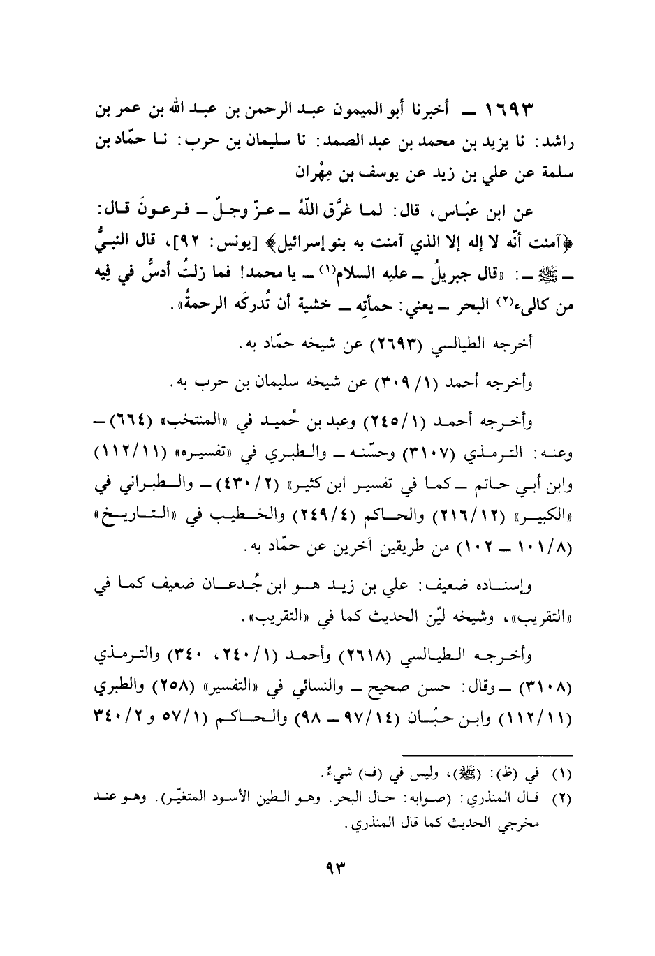 1693 - أخبرنا أبو الميمون عبد الرحمن بن عبد الله بن عمر بن راشد: نا يزيد بن محمَّد بن عبد الصمد: نا سليمان بن حرب: نا حمّاد بن سلمة عن علي بن زيد عن يوسف بن مِهْران
