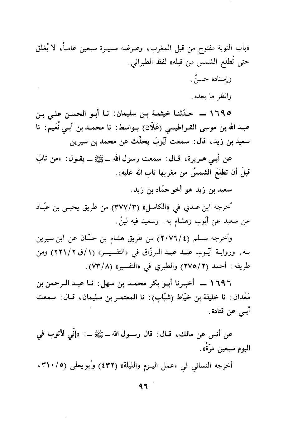 1696 - أخبرنا أبو بكر محمَّد بن سهل: نا عبد الرحمن بن مَعْدان: نا خليفة بن خيّاط (شبّاب): نا المعتمر بن سليمان، قال: سمعت أبي عن قتادة.