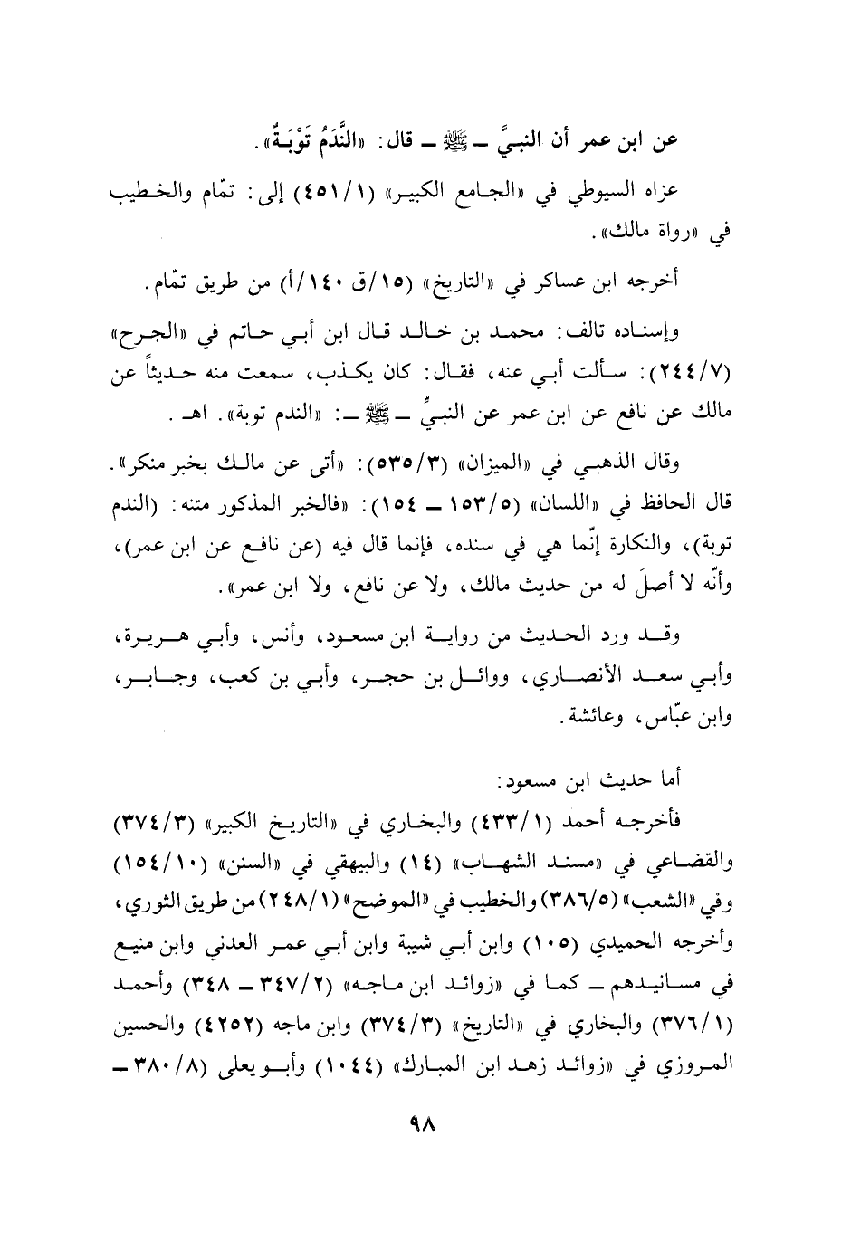 وقال الذهبي في "الميزان" (3/ 535): "أتى عن مالك بخبر منكر". قال الحافظ في "اللسان" (5/ 153 - 154): "فالخبر المذكور متنه: (الندم توبة)، والنكارة إنّما هي في سنده، فإنما قال فيه (عن نافع عن ابن عمر)، وأنّه لا أصلَ له من حديث مالك، ولا عن نافع، ولا ابن عمر".