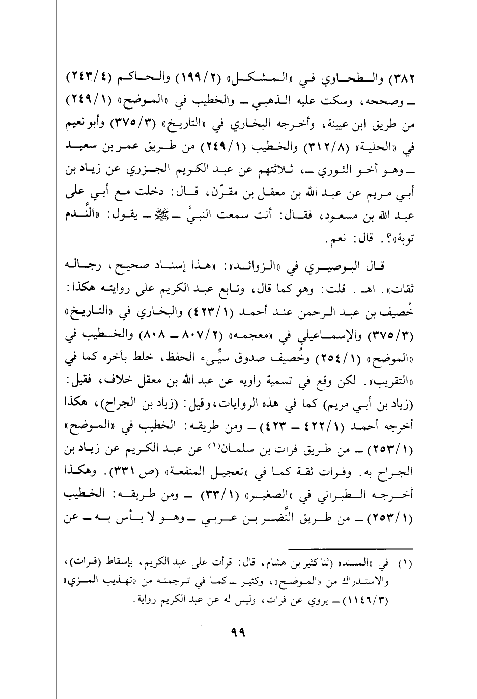 قال البوصيري في "الزوائد": "هذا إسناد صحيح، رجاله ثقات". أهـ. قلت: وهو كما قال، وتابع عبد الكريم على روايته هكذا: خُصيف بن عبد الرحمن عند أحمد (1/ 423) والبخاري في "التاريخ" (3/ 375) والإسماعيلي في "معجمه" (2/ 807 - 808) والخطيب في "الموضح" (1/ 254) وخُصيف صدوق سيِّىء الحفظ، خلط بآخره كما في "التقريب". لكن وقع في تسمية راويه عن عبد الله بن معقل خلاف، فقيل: (زياد بن أبي مريم) كما في هذه الروايات، وقيل: (زياد بن الجراح)، هكذا أخرجه أحمد (1/ 422 - 423) -ومن طريقه: الخطيب في "الموضح" (1/ 253) - من طريق فرات بن سلمان (¬1) عن عبد الكريم عن زياد بن الجراح به. وفرات ثقة كما في "تعجيل المنفعة" (ص 331). وهكذا أخرجه الطبراني في "الصغير" (1/ 33) -ومن طريقه: الخطيب (1/ 253) - من طريق النَّضر بن عربي -وهو لا بأس به- عن