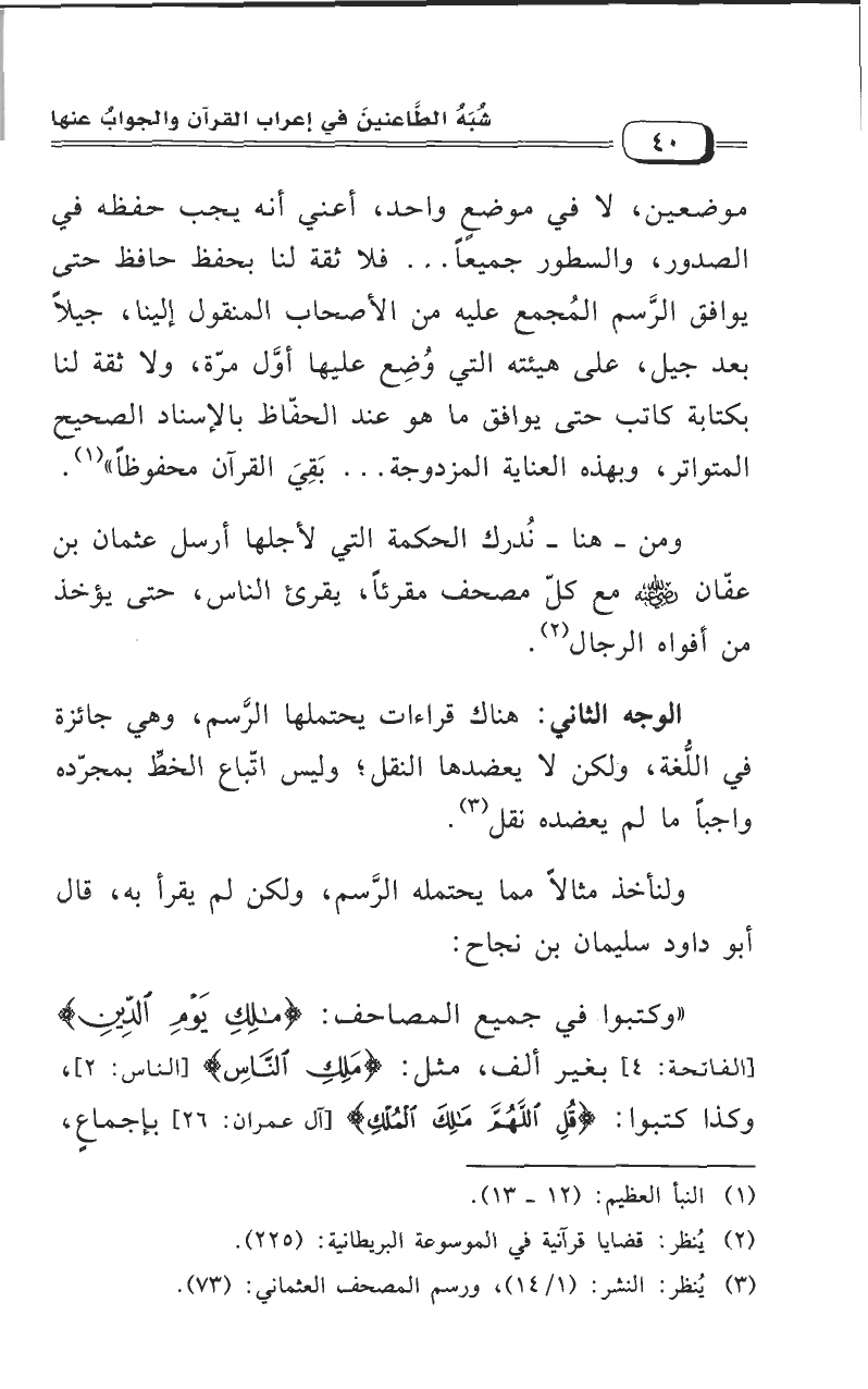 موضعين، لا في موضعٍ واحد، أعني أنه يجب حفظه في الصدور، والسطور جميعا ... فلا ثقة لنا بحفظ حافظ حتى يوافق الرسم المُجمع عليه من الأصحاب المنقول إلينا، جيلاً بعد جيل، على هيئته التي وُضِع عليها أول مرّة، ولا ثقة لنا بكتابة كاتب حتى يوافق ما هو عند الحفاظ بالإسناد الصحيح المتواتر، وبهذه العنالة المزدوجة ... بَقِيَ القرآن محفوظاً".