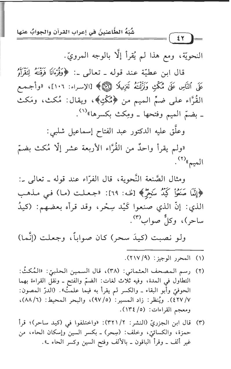 وعلَّق عليه الدكتور عبد الفتاح إسماعيل شلبي: "ولم يقرأ واحد من القُرَّاء الأربعة عشر إلا مُكث بضمّ الميم ".
