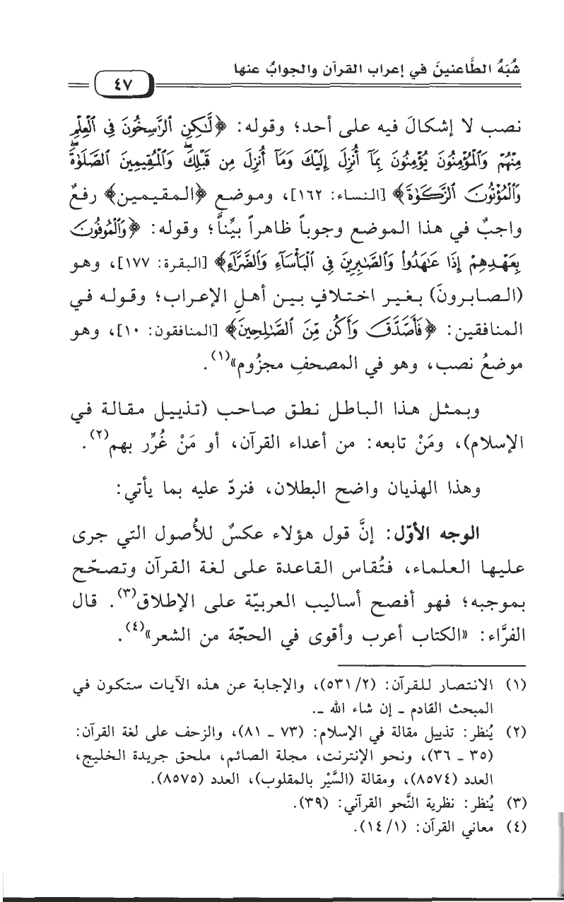 نصب لا إشكالَ فيه على أحد، وقوله: (لَكِنِ الرَّاسِخُونَ فِي الْعِلْمِ مِنْهُمْ وَالْمُؤْمِنُونَ يُؤْمِنُونَ بِمَا أُنْزِلَ إِلَيْكَ وَمَا أُنْزِلَ مِنْ قَبْلِكَ وَالْمُقِيمِينَ الصَّلَاةَ وَالْمُؤْتُونَ الزَّكَاةَ)، وموضعِ (وَالْمُقِيمِينَ) رفعٌ واجبٌ في هذا الموضع وجوباً ظاهراً بيناً؛ وقوله: (وَالْمُوفُونَ بِعَهْدِهِمْ إِذَا عَاهَدُوا وَالصَّابِرِينَ فِي الْبَأْسَاءِ وَالضَّرَّاءِ)، وهو (الصابرونَ) بغير اختلافٍ بين أهلِ الإعراب؛ وقوله في المنافقين: (فَأَصَّدَّقَ وَأَكُنْ مِنَ الصَّالِحِينَ (10))، وهو موضعُ نصب، وهو في المصحفِ مجزُوم ".