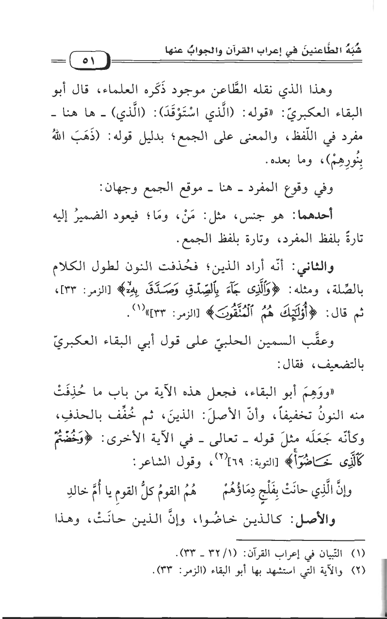 والثاني: أنّه أراد الذين؛ فحُذفت النون لطول الكلام بالصِّلة، ومثله: (وَالَّذِي جَاءَ بِالصِّدْقِ وَصَدَّقَ بِهِ) ثم قال: (أُولَئِكَ هُمُ الْمُتَّقُونَ) ".