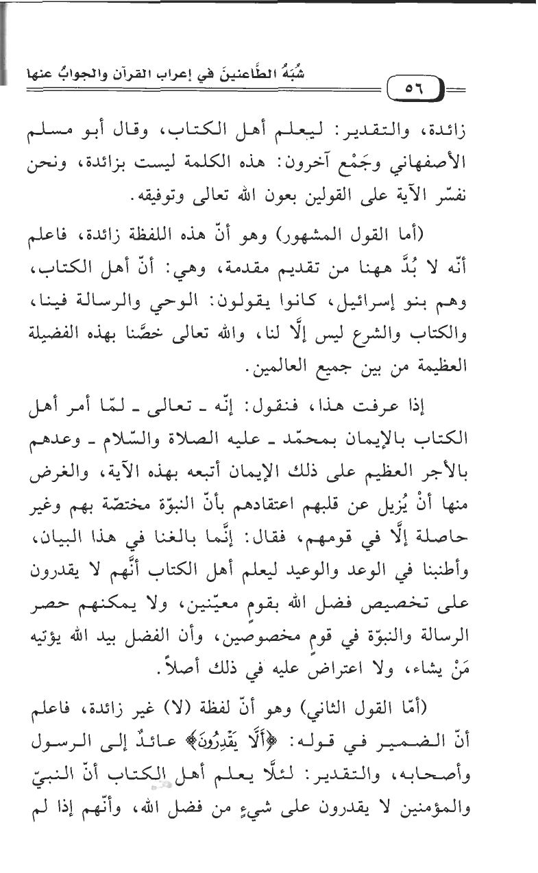 زائدة، والتقدير: ليعلم أهل الكتاب، وقال أبو مسلم الأصفهاني وجَمْع آخرون: هذه الكلمة ليست بزائدة، ونحن نفسّر الآية على القولين بعون الله تعالى وتوفيقه.