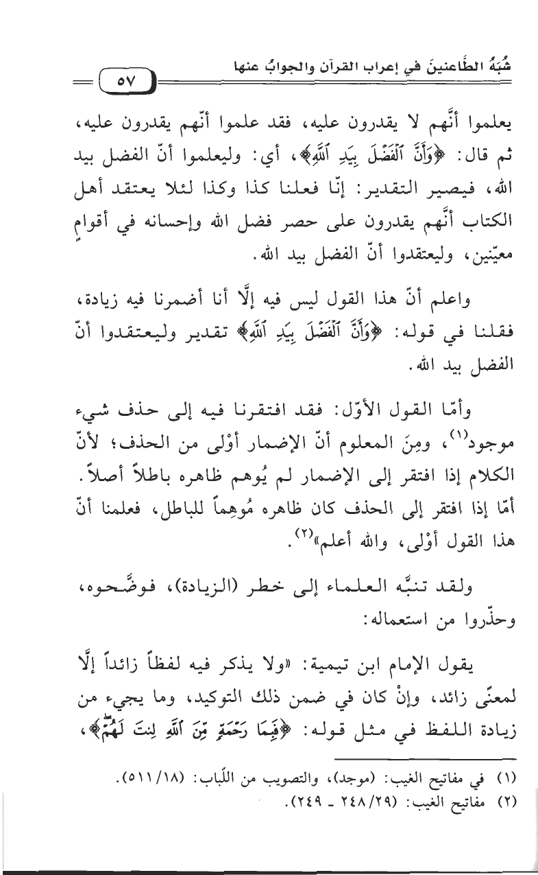 يعلموا أنَهم لا يقدرون عليه، فقد علموا أنّهم يقدرون عليه، ثم قال: (وَأَنَّ الْفَضْلَ بِيَدِ اللَّهِ)، أي: وليعلموا أنّ الفضل بيد الله، فيصير التقدير: إنّا فعلنا كذا وكذا لئلا يعتقد أهل الكتاب أنَهم يقدرون على حصر فضل الله وإحسانه في أقوامٍ معيّنين، وليعتقدوا أنّ الفضل بيد الله.