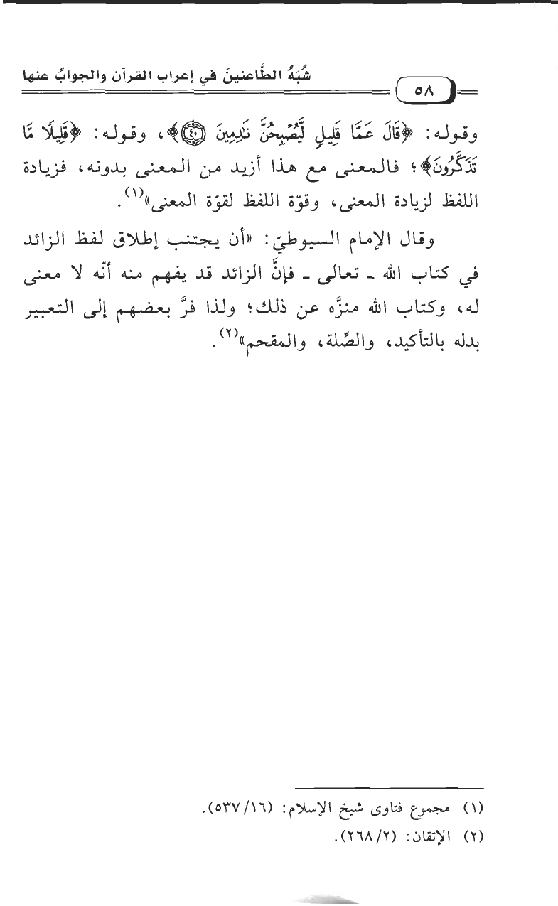 وقال الإمام السيوطيّ: "أن يجتنب إطلاق لفظ الزائد في كتاب الله - تعالى - فإنَّ الزائد قد يفهم منه أنّه لا معنى له، وكتاب الله منزَّه عن ذلك؛ ولذا فرَّ بعضهم إلى التعبير بدله بالتأكيد، والصِّلة، والمقحم ".