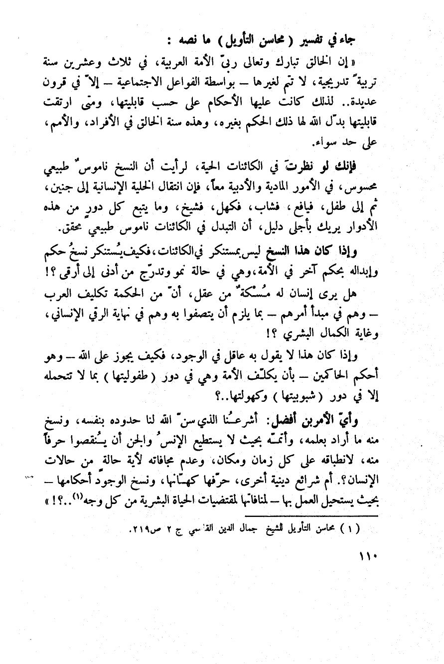 جاء في تفسير «محاسن التأويل» ما نصه: «إن الخالق تبارك وتعالى ربّى الأمة العربية، في ثلاث وعشرين سنة تربيةً تدريجية، لا تتم لغيرها - بواسطة الفواعل الاجتماعية - إلاّ في قرون عديدة. . لذلك كانت عليها الأحكام على حسب قابليتها، ومتى ارتقت قابليتها بدّل الله لها ذلك الحكم بغيره، وهذه سنة الخالق في الأفراد، والأمم، على حد سواء.