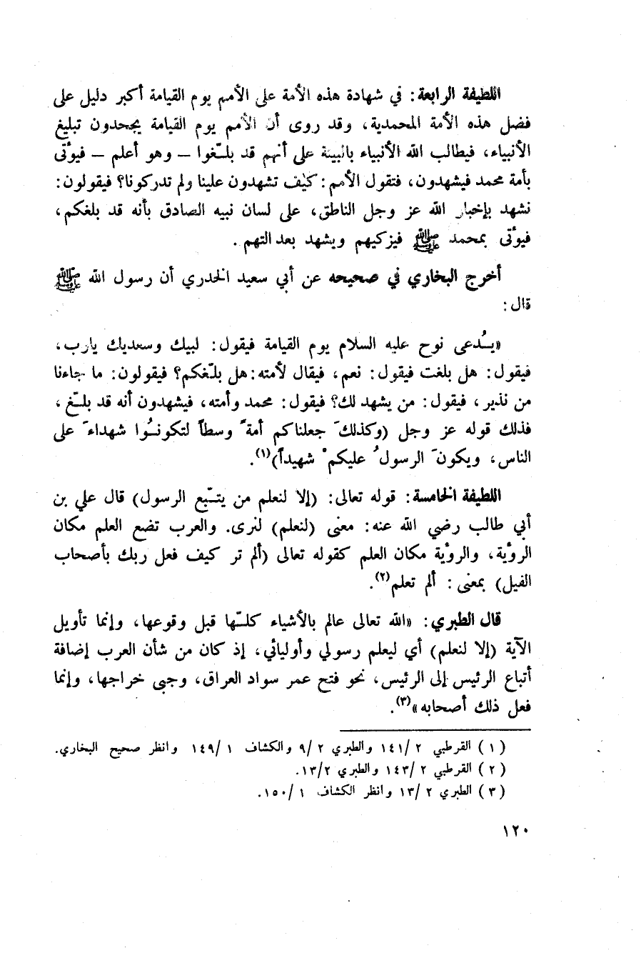 اللطيفة الرابعة: في شهادة هذه الأمة على الأمم يوم القيامة أكبر دليل على فضل هذه الأمة المحمدية، وقد روي أن الأمم يوم القيامة يجحدون تبليغ الأنبياء، فيطالب الله الأنبياء بالبينة على أنهم قد بلّغوا - وهو أعلم - فيؤتى بأمة محمد فيشهدون، فتقول الأمم: كيف تشهدون علينا ولم تدركونا؟ فيقولون: نشهد بإخبار الله عَزَّ وَجَلَّ الناطق، على لسان نبيه الصادق بأنه قد بلغكم، فيؤتى بمحمد صَلَّى اللَّهُ عَلَيْهِ وَسَلَّم َ فيزكيهم ويشهد بعدالتهم.