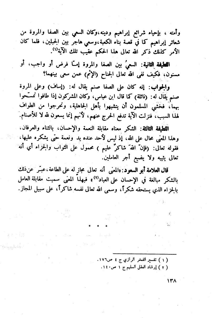 اللطيفة الثانية: السعيُ بين الصفا والمروة إمّا فرض أو واجب، أو مسنون، فكيف نفى الله تعالى الجناح (الإثم) عمن سعى بينهما؟