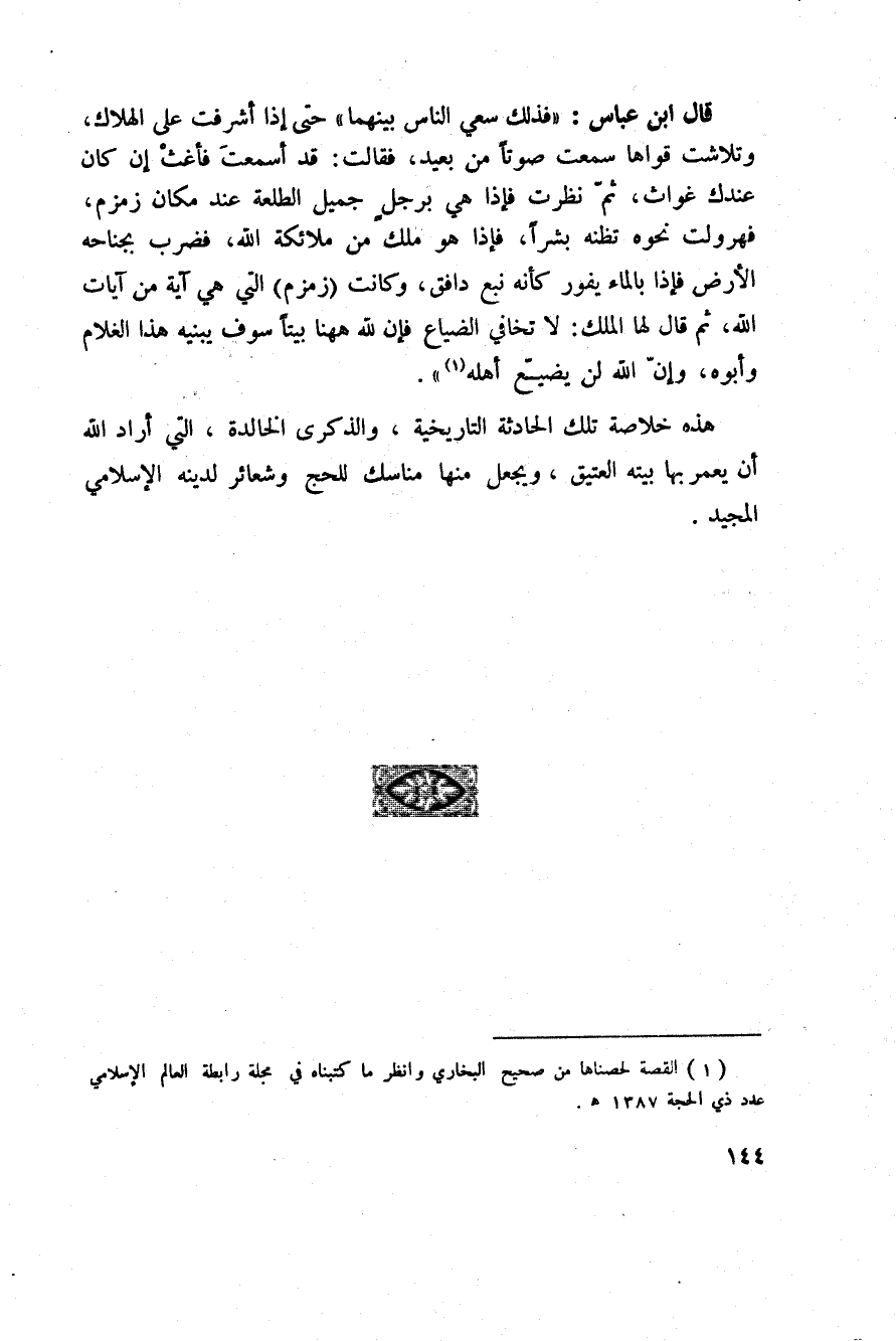 قال ابن عباس: «فذلك سعي الناس بينهما» حتى إذا أشرفت على الهلاك، وتلاشت قواها سمعت صوتاً من بعيد، فقالت: قد أسمعتَ فأغثْ إن كان عندك غواث، ثمّ نظرت فإذا هي برجلٍ جميل الطلعة عند مكان زمزم، فهرولت نحوه تظنه بشراً، فإذا هو ملك من ملائكة الله، فضرب بجناحه الأرض فإذا بالماء يفور كأنه نبع دافق، وكانت (زمزم) التي هي آية من آيات الله، ثم قال لها الملك: لا تخافي الضياع فإن لله هاهنا بيتاً سوف يبنيه هذا الغلام وأبوه، وإنّ الله لن يضيّع أهله «.
