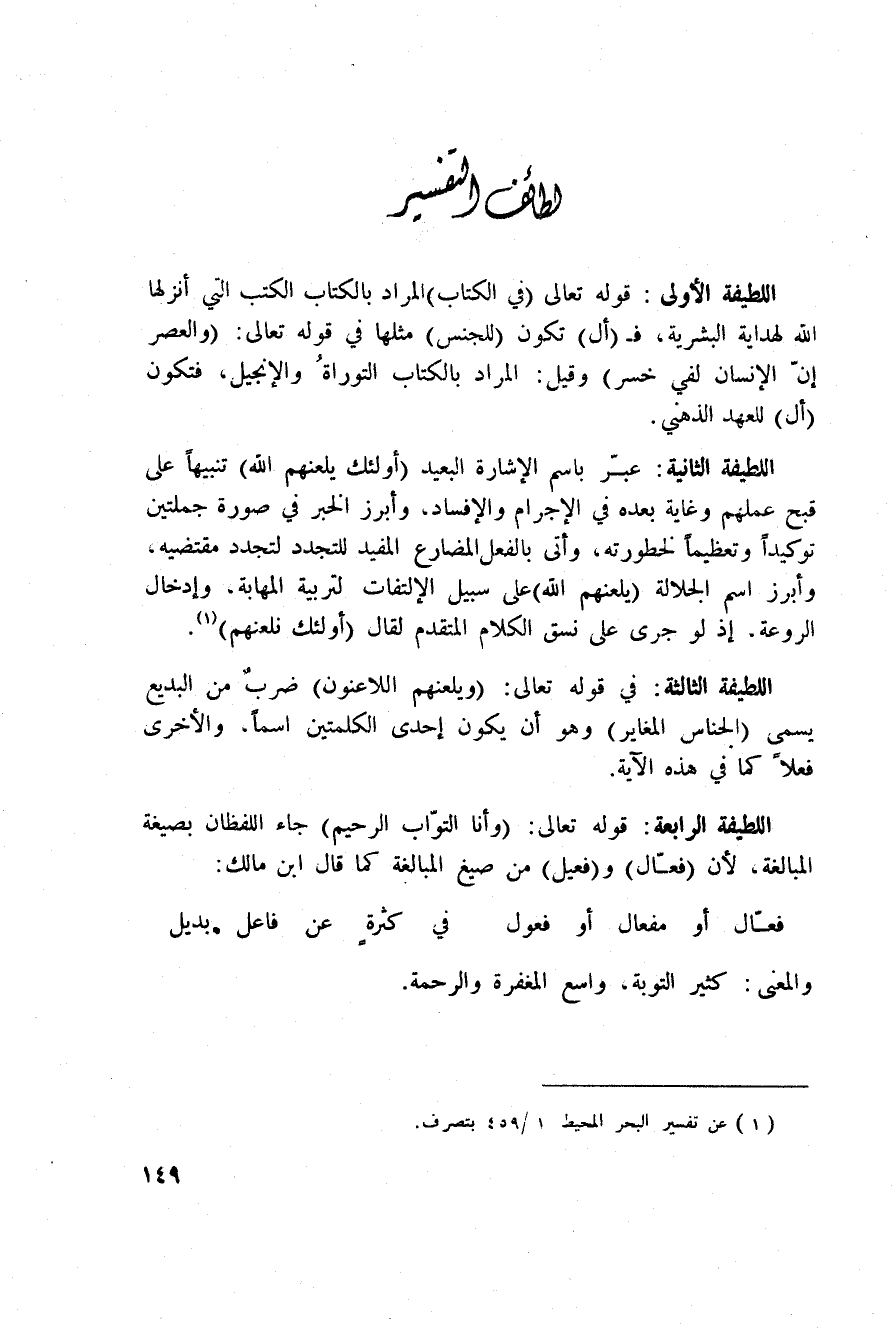 اللطيفة الأولى: قوله تعالى {فِي الكتاب} المراد بالكتاب الكتب التي أنزلها الله لهداية البشرية، ف (أل) تكون (للجنس) مثلها في قوله تعالى: {والعصر إِنَّ الإنسان لَفِى خُسْر} [العصر: 1 - 2] وقيل: المراد بالكتاب التوراةُ والإنجيل، فتكون (أل) للعهد الذهني.