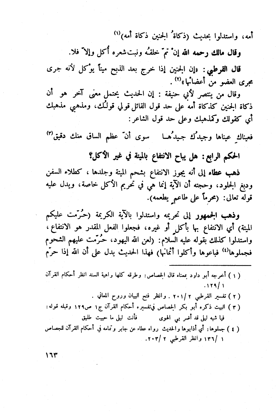 قال القرطبي: «إن الجنين إذا خرج بعد الذبح ميتاً يؤكل لأنه جرى مجرى العضو من أعضائها» .