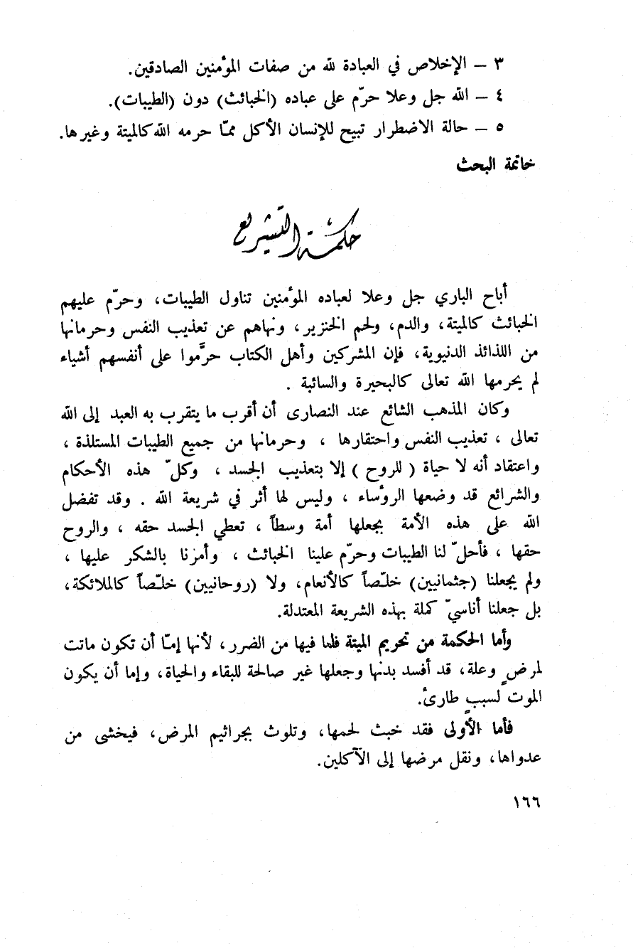 وكان المذهب الشائع عند النصارى أن أقرب ما يتقرب به العبد إلى الله تعالى، تعذيب النفس واحتقارها، وحرمانها من جميع الطيبات المستلذة، واعتقاد أنه لا حياة (للروح) إلا بتعذيب الجسد، وكلّ هذه الأحكام والشرائع قد وضعها الرؤساء، وليس لها أثر في شريعة الله. وقد تفضل الله على هذه الأمة بجعلها أمة وسطاً، تعطي الجسد حقه، والروح حقها، فأحلّ لنا الطيبات وحرّم علينا الخبائث، وأمرنا بالشكر عليها، ولم يجعلنا (جثمانيين) خلّصاً كالأنعام، ولا (روحانيين) خلصاً كالملائكة، بل جعلنا أناسيّ كملة بهذه الشيعة المعتدلة.