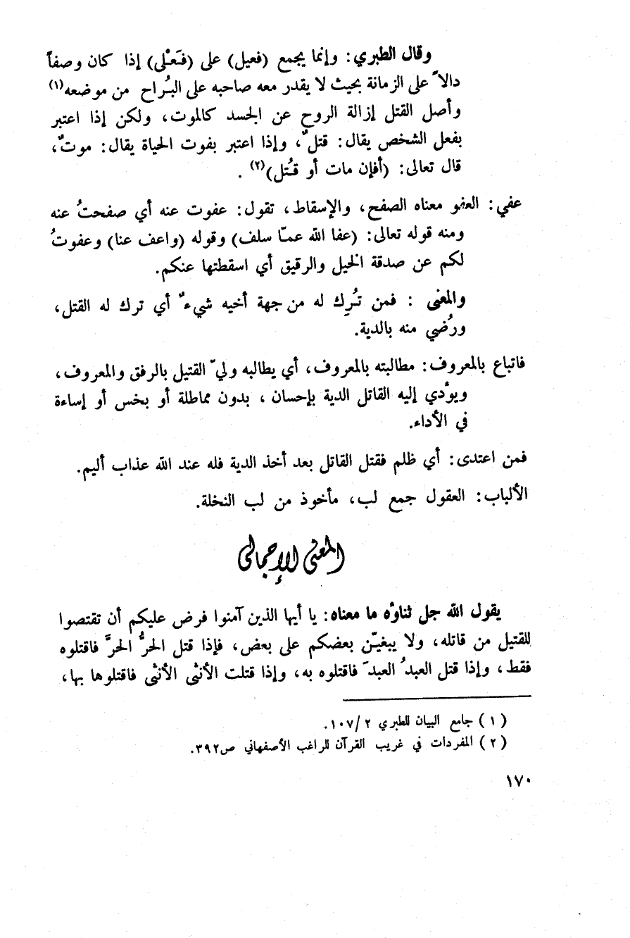 وقال الطبري: وإنما يجمع (فعيل) على (فَعْلى) إذا كان وصفاً دالاً على الزمانة بحيث لا يقدر معه صاحبه على البُراح من موضعه وأصل القتل إزالة الروح عن الجسد كالموت، ولكن إذا اعتبر بفعل الشخص يقال: قتلٌ، وإذا عتبر بفوت الحياة يقال: موتٌ، قال تعالى: {أَفإِنْ مَّاتَ أَوْ قُتِلَ} [آل عمران: 144] .