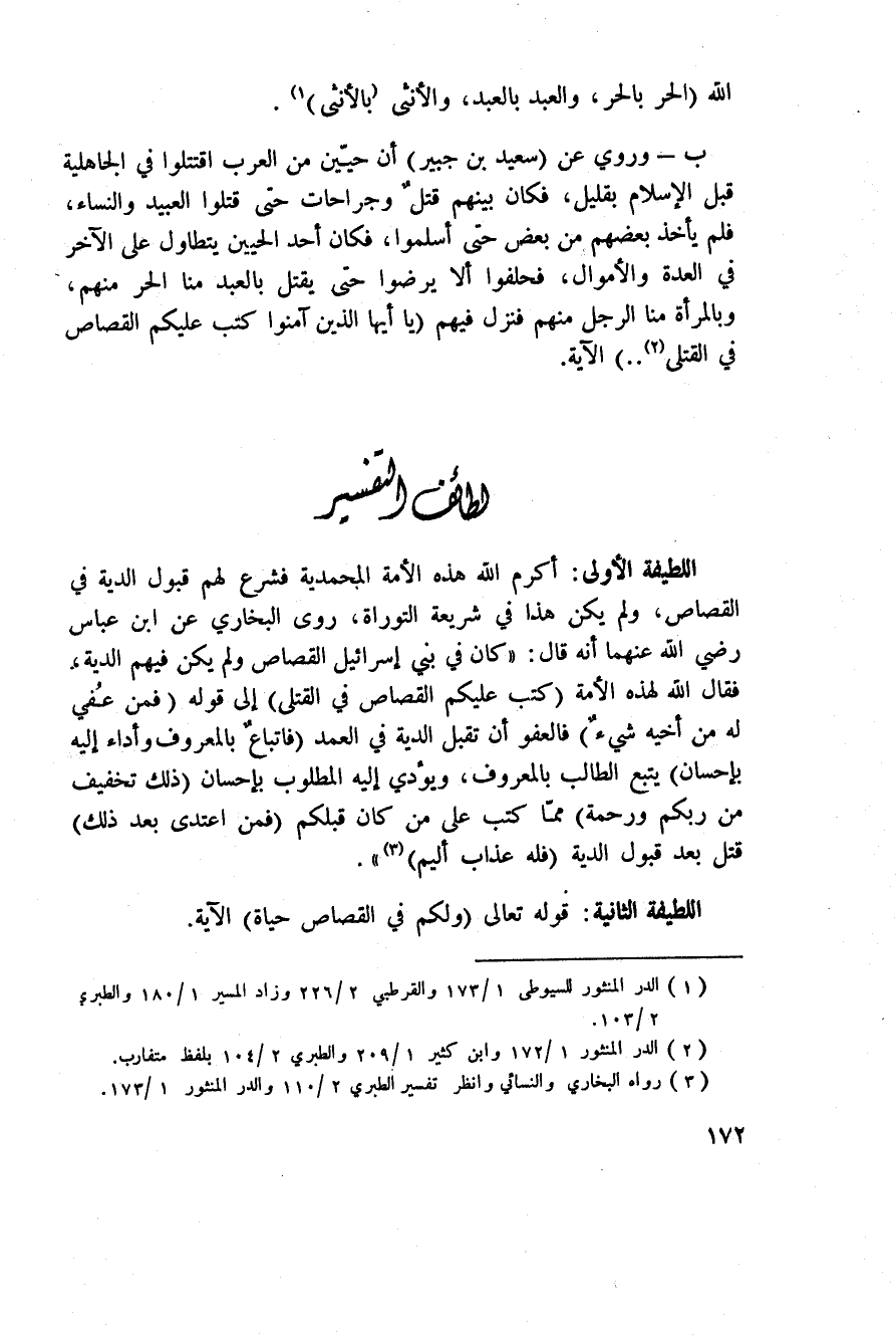 اللطيفة الأولى: أكرم الله هذه الأمة المحمدية فشرع لهم قبول الدية في القصاص، ولم يكن هذا في شريعة التوراة، روي البخاري عن ابن عباس رَضِيَ اللَّهُ عَنْهما أنه قال: «كان في بني إسرائيل القصاص ولم يكن فيهم الدية، فقال الله لهذه الأمة {كُتِبَ عَلَيْكُمُ القصاص فِي القتلى} إلى قوله: {فَمَنْ عُفِيَ لَهُ مِنْ أَخِيهِ شَيْءٌ} فالعفو أن تقبل الدية في العمد {فاتباع بالمعروف وَأَدَآءٌ إِلَيْهِ بِإِحْسَانٍ} يتبع الطالب بالمعروف، ويؤدي إليه المطلوب بإحسان {ذلك تَخْفِيفٌ مِّن رَّبِّكُمْ وَرَحْمَةٌ} ممّا كتب على من كان قبلكم {فَمَنِ اعتدى بَعْدَ ذلك} قتل بعد قبول الدية {فَلَهُ عَذَابٌ أَلِيمٌ} .