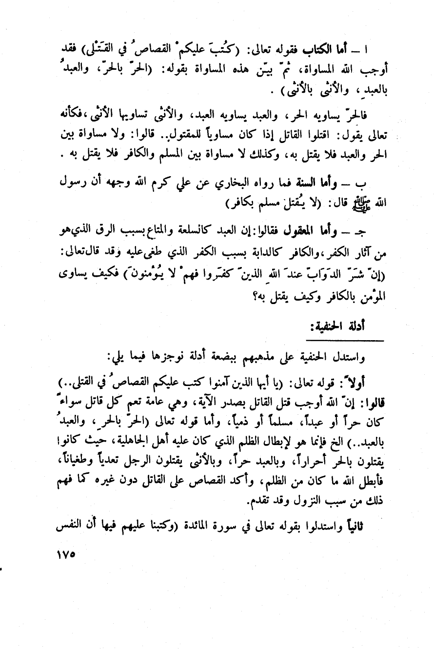 أ - أما الكتاب فقوله تعالى: {كُتِبَ عَلَيْكُمُ القصاص فِي القتلى} فقد أوجب الله المساواة، ثمّ بيّن هذه المساواة بقوله: {الحر بِالْحُرِّ والعبد بالعبد والأنثى بالأنثى} .