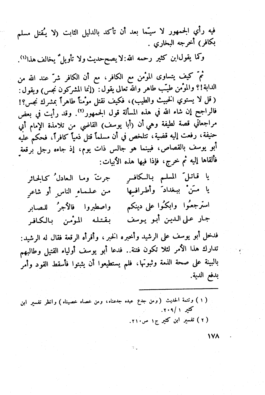 ثمّ كيف يتساوى المؤمن مع الكافر، مع أن الكافر شرّ عند الله من الدابة؟ والمؤمن طيّب طاهر والله تعالى يقول: {إِنَّمَا المشركون نَجَسٌ} [التوبة: 28] ويقول: {قُل لاَّ يَسْتَوِي الخبيث والطيب} [المائدة: 100] ، فكيف نقتل مؤمناً طاهراً بمشرك نجس؟! فالراجح إن شاء الله في هذه المسألة قول الجمهور. وقد رأيت في بعض مراجعاتي قصة لطيفة وهي أن (أبا يوسف) القاضي من تلامذة الإمام أبي حنيفة، رفعت إليه قضية، تتلخص في أن مسلماً قتل ذمياً كافراً، فحكم عليه أبو يوسف بالقصاص، فبينما هو جالس ذات يوم، إذ جاءه رجل برقعةٍ فألقاها إليه ثم خرج، فإذا فيها هذه الأبيات:
