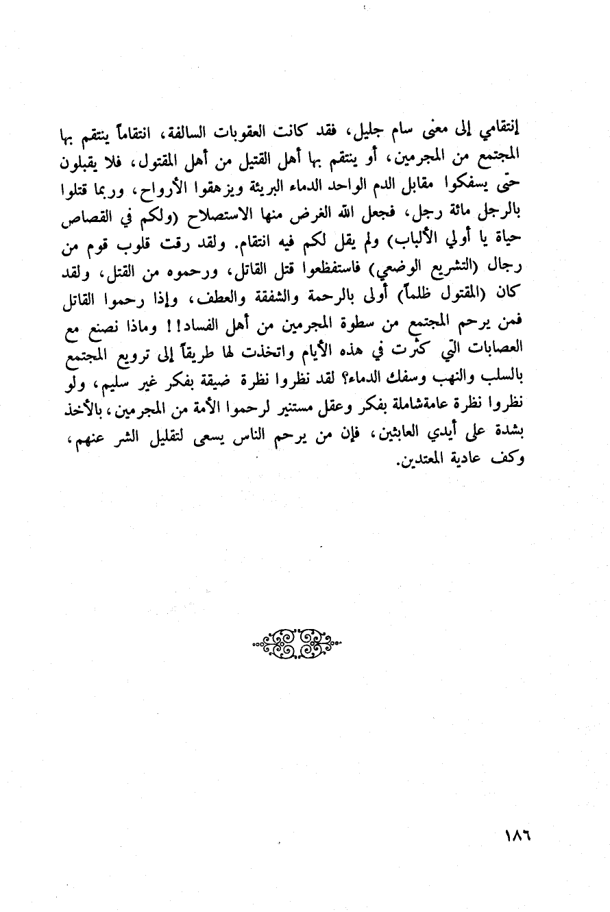 انتقامي إلى معنى سام جليل، فقد كانت العقوبات السالفة، انتقاماً ينتقم بها المجتمع من المجرمين، أو ينتقم بها أهل القتيل من أهل المقتول، فلا يقبلون حتى يسفكوا مقابل الدم الواحد الدماء البريئة ويزهقوا الأرواح. وربما قتلوا بالرجل مائة رجل، فجعل الله الغرض منها الاستصلاح {وَلَكُمْ فِي القصاص حياوة ياأولي الألباب} ولم قل لكم فيه انتقام. ولقد رقت قلوب قوم من رجال (التشريع الوضعي) فاستفظعوا قتل القاتل، ورحموه من القتل، ولقد كان (المقتول ظلماً) أولى بالرحمة والشفقة والعطف، وإذا رحموا القاتل فمن يرحم المجتمع من سطوة المجرمين من أهل الفساد!! وماذا نصنع مع العصابات التي كثرت في هذه الأيام واتخذت لها طريقاً إلى ترويع المجتمع بالسلب والنهب وسفك الدماء؟ لقد نظروا نظرة ضيقة بفكر غير سليم، ولو نظروا عامة شاملة بفكر وعقل مستنير لرحموا الأمة من المجرمين، بالأخذ بشدة على أيدي العابثين، فإن من يرحم الناس يسعى لتقليل الشر عنهم، وكف عادية المعتدين.
